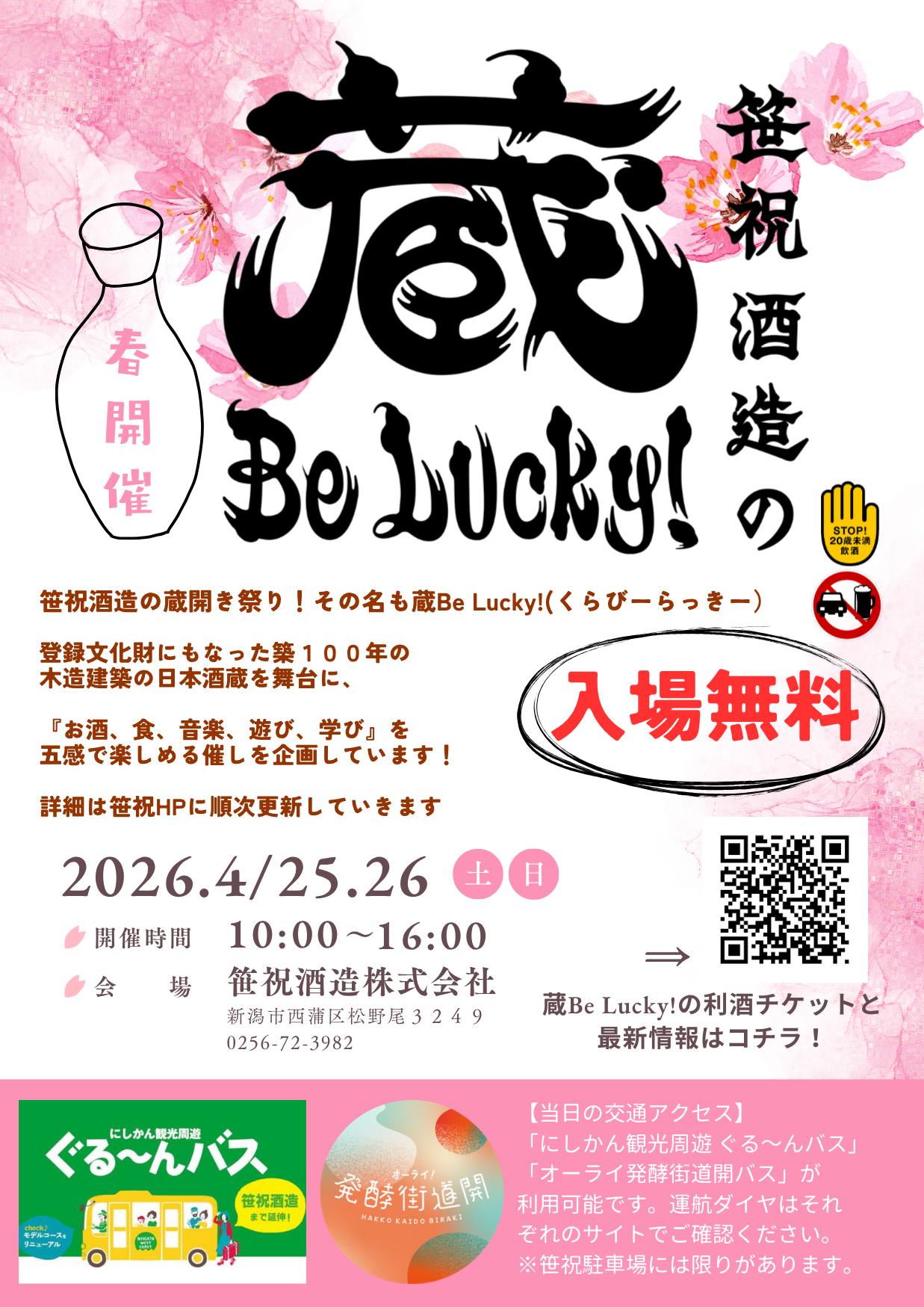 笹祝酒造の蔵開き、蔵Be Lucky!(くらびーらっきー)。今年も4月25(土)26(日)に開催いたします。日本酒に、食べ物に、音楽に、遊びに学びを詰め込んだ、笹祝酒造の手作りイベントです。